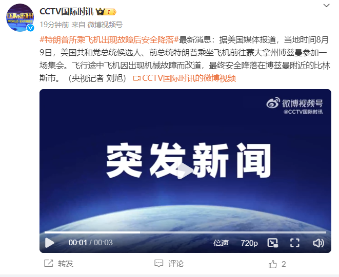 @CCTV国际时讯消息,据美国媒体报道,当地时间8月9日,美国共和党总统候选人、前总统特朗普乘坐飞机前往蒙大拿州博兹曼参加一场集会。飞行途中飞机因出现机械故障而改道,最终安全降落在博兹曼附近的比林斯市。